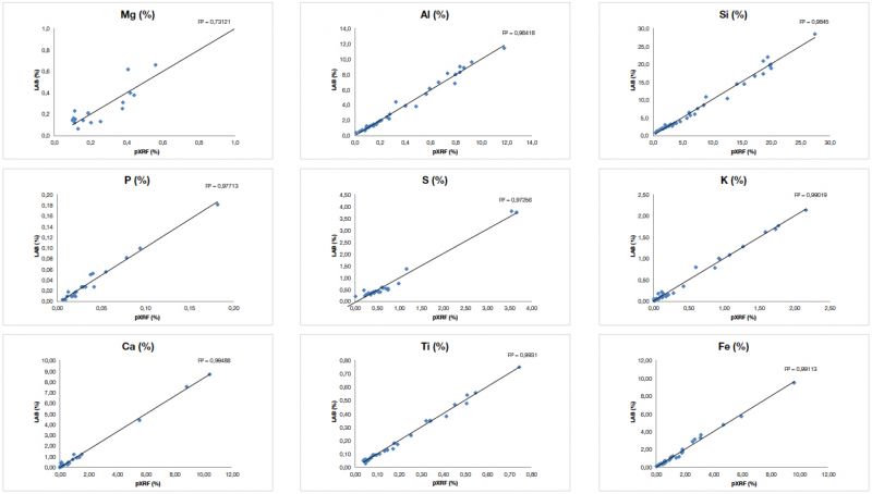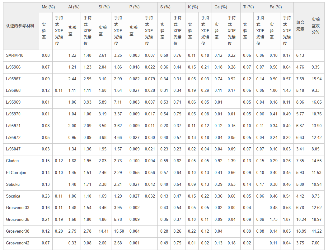 圖2. 奧林巴斯手持式XRF光譜儀檢測(cè)大量煤認(rèn)證參考材料(CRM)獲得的結(jié)果與這些材料的標(biāo)稱值高度吻合。上面的圖表表明對(duì)于重要元素:Mg、Al、Si、P、S、K、Ca、Ti和Fe,實(shí)驗(yàn)室認(rèn)證值和XRF分析儀獲得的數(shù)據(jù)值在準(zhǔn)確性和精確性方面都表現(xiàn)出高度的一致性。 數(shù)據(jù)表包含了繪制這些圖表所依據(jù)的實(shí)驗(yàn)室數(shù)據(jù)和XRF數(shù)據(jù)。數(shù)據(jù)承蒙新南威爾士大學(xué)生物和地球科學(xué)學(xué)院提供 - ACARP項(xiàng)目。