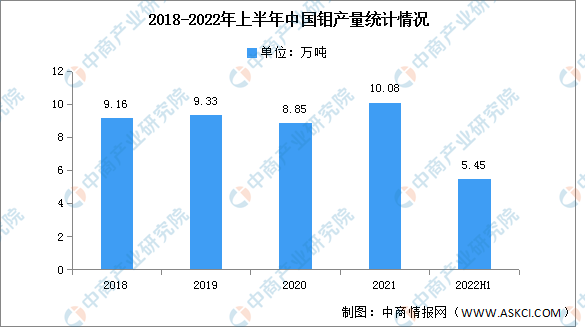 我國2022年第一季度鉬的產量為25855噸,環比減少了2%,但同比增加了6%;第二季度產量為28621.5噸,環比增加了4%,同比增加了14%。