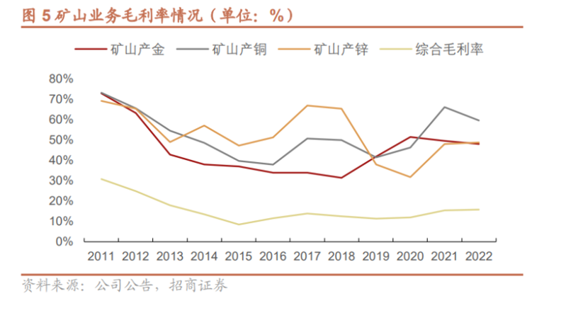 2022年,紫金礦業全年實現營業收入達2703億元,凈利潤達200.42億元,其中礦山產金毛利率47.97%,礦山產銅毛利率59.53%,礦山產鋅毛利率48.69%。