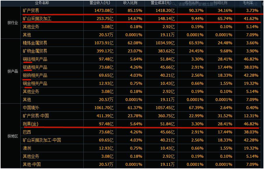 2022年,洛陽鉬業實現營業收入1729.91億元,凈利潤為60.67億元,雖然創造歷史最好業績,但相比于近2000億元的營收,其實際的凈利潤率并不高,而細看主營業務,其占了收入85%的礦產貿易,毛利率只有3.73%!而其礦產采掘和加工的業務的毛利率達到了41.62%,貢獻了總利潤的65.74%。