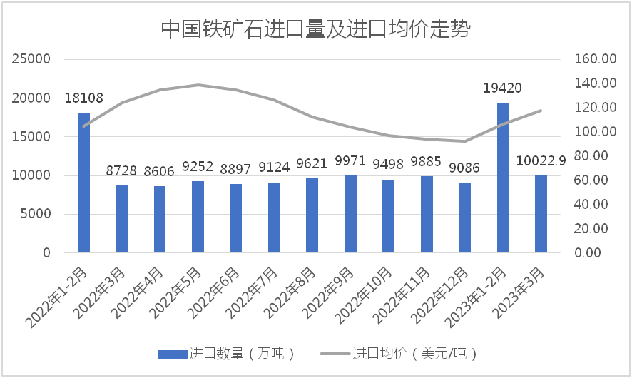 據海關總署數據顯示,2023年1-3月份,我國累計進口鐵礦石29433.5萬噸,同比增長9.8%,進口均價110.6美元/噸,同比下降12.0%。但值得注意的是,今年3月份,我國進口鐵礦石量價齊升,單月進口鐵礦石達到10022.9萬噸,同比增長14.8%,進口均價為117.7美元/噸,較今年1-2月均價上漲11.43美元/噸,增長10.76%。