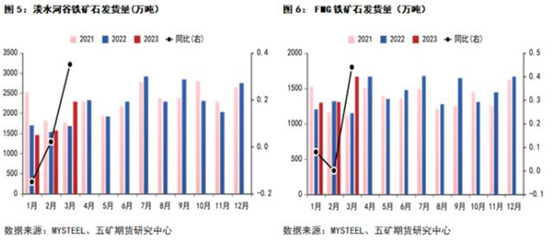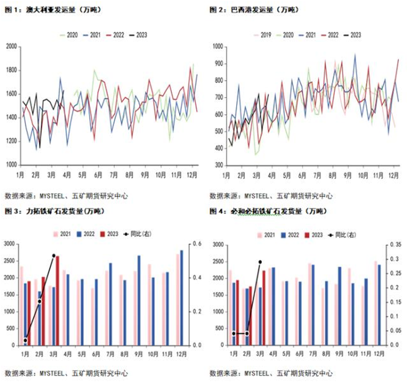 據mysteel和五礦期貨統計,四大礦山3月份發貨數據同比大幅增加。3月份力拓發貨量2595.6萬噸,同比增加50%;必和必拓發貨量2152萬噸,同比增加25%。淡水河谷發貨量2189.4萬噸,同比增加30%;FMG發貨量1622.3萬噸,同比增加41%。