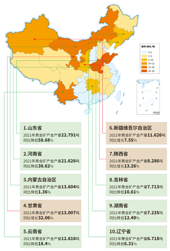 2021年,新疆黃金產(chǎn)量11.626噸,位列全國(guó)第五。