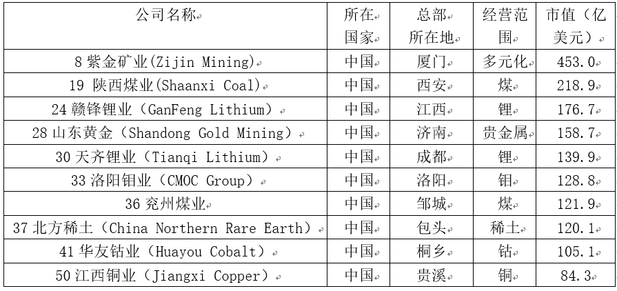 共有十家中國礦企上榜