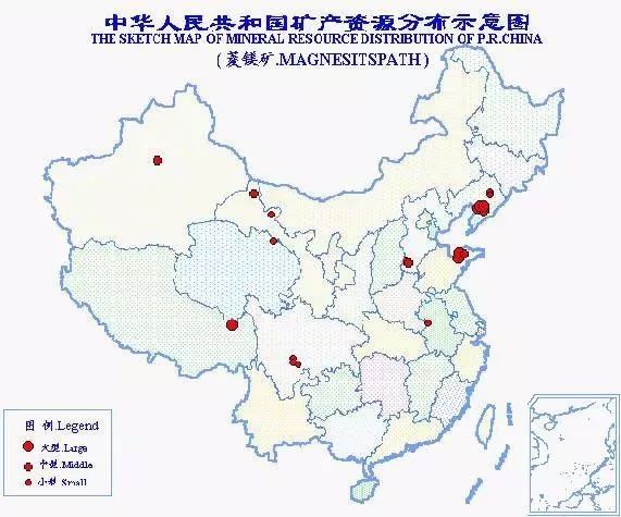中國是世界上菱鎂礦資源最為豐富的國家。總保有儲量礦石30億噸,居世界第1位。我國菱鎂礦的重要特點是地區分布不廣、儲量相對集中,大型礦床多。探明儲量的礦區27處,分布于9個省(區),以遼寧菱鎂礦儲量最為豐富,占全國的85.6%。