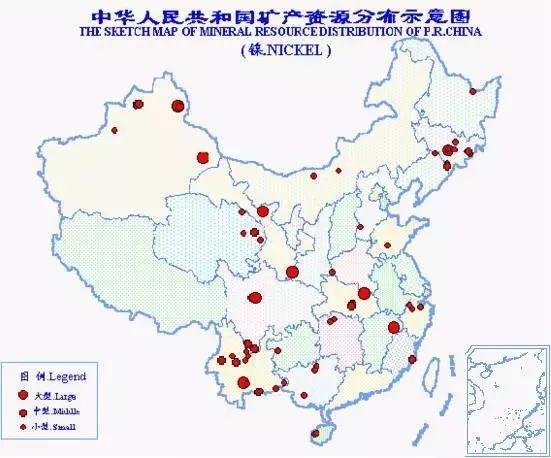 中國鎳礦資源不能滿足需要。總保有儲量鎳784萬噸,居世界第9位。鎳礦產地有近100處,分布于18個省(區)。