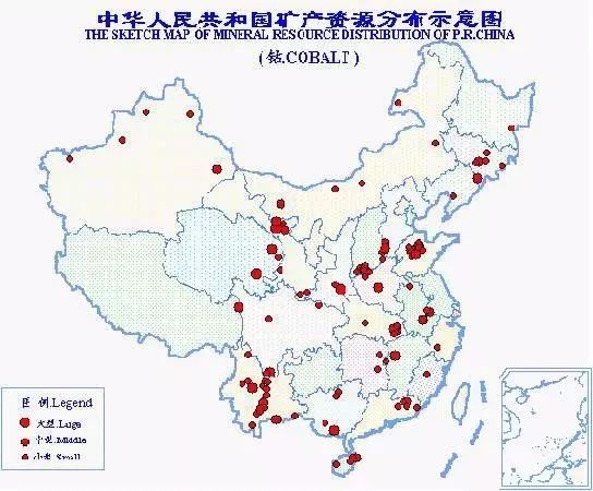 中國鈷礦資源不多,獨立鈷礦床尤少,主要作為伴生礦產與鐵、鎳、銅等其他礦產一道產出。已知鈷礦產地150處,分布于24個省(區),以甘肅省儲量最多,約占全國總儲量的30%。全國總保有儲量鈷47萬噸。