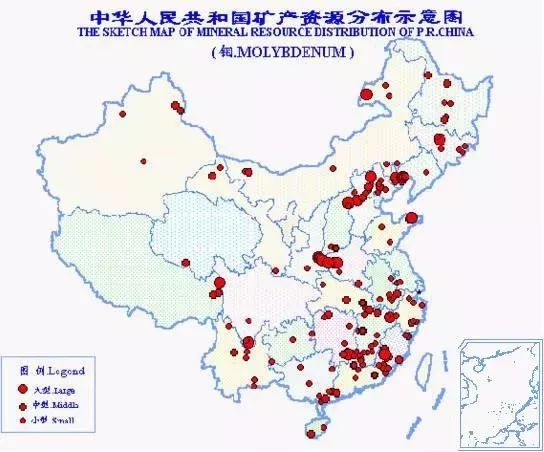 中國鉬礦資源豐富,總保有儲量鉬840萬噸,居世界第2位。探明儲量的礦區有222處,分布于28個省(區、市)。以河南省鉬礦資源為最豐富,鉬儲量占全國總儲量的30.1%。