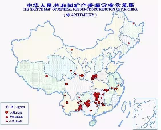 中國是世界上銻礦資源最為豐富的國家。總保有儲量銻278萬噸,居世界第1位。已探明儲量的礦區有111處,分布于全國18個省(區),以廣西銻儲量為最多,約占全國的41.3%;其次為湖南、云南、貴州、甘肅、廣東等省。