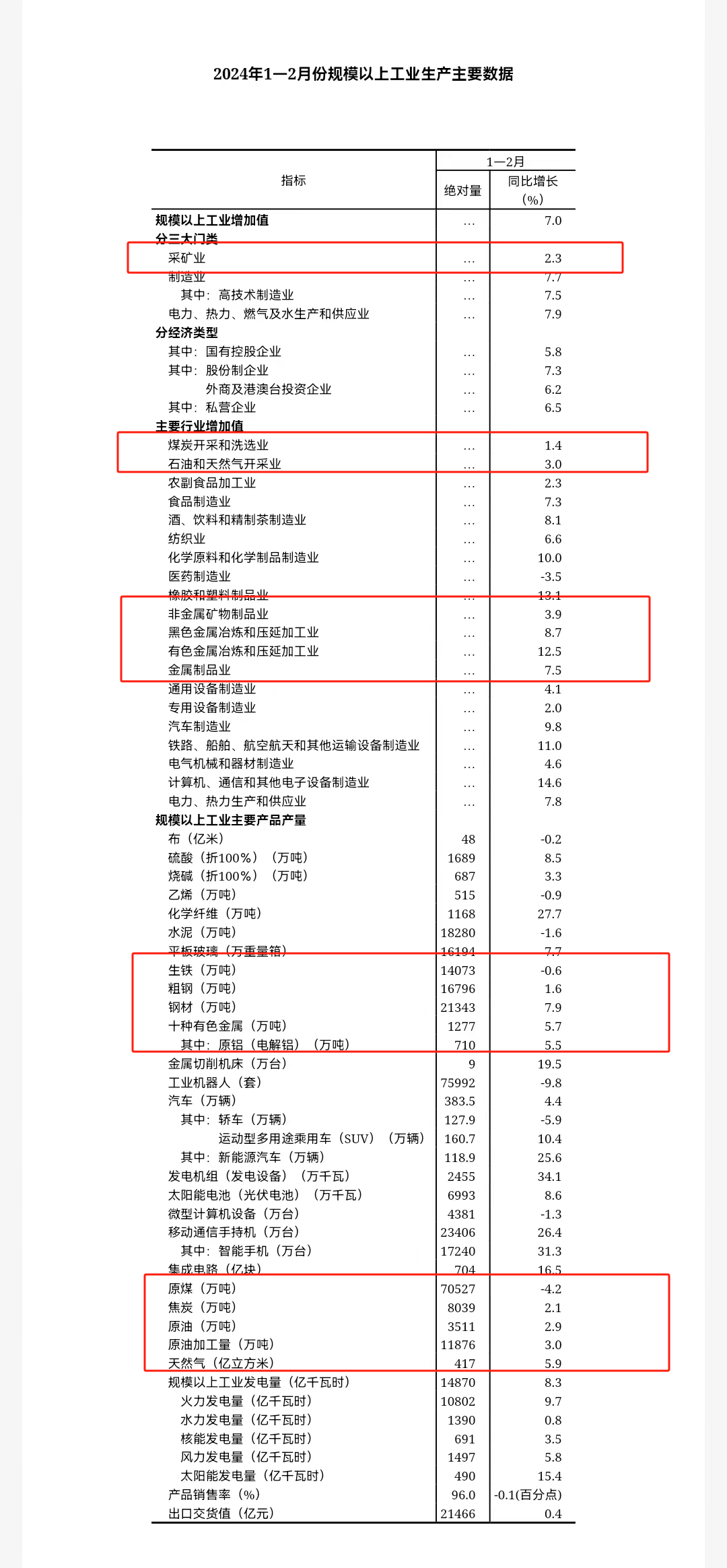 分行業看,1—2月份,41個大類行業中有39個行業增加值保持同比增長。其中,涉礦主要行業利潤情況如下:煤炭開采和洗選業增長1.4%,石油和天然氣開采業增長3.0%,金屬礦物制品業增長3.9%,黑色金屬冶煉和壓延加工業增長8.7%,有色金屬冶煉和壓延加工業增長12.5%。