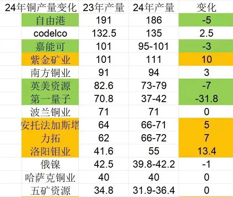 智利國家銅業公司、南方銅業公司、波蘭國家銅業集團、哈薩克銅業、淡水河谷均有小幅增長預期或與2023年保持不變。