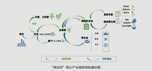 “鎂經濟”是新能源與新材料相融合的綠色循環經濟。“鎂經濟”綠色循環產業鏈的源頭,從原料講是取之不盡的海鹵水,從能源講是用之不竭的可再生能源。利用鎂既是工業材料又是能源載體的雙重屬性,“鎂經濟”可同時實現新能源和新材料兩大產業的綠色循環、優勢整合:既解決了風光電的儲能難題,又將無法處理的鹽化工行業廢棄物苦鹵“變廢為寶”,變成可帶動國民經濟眾多領域實現產業升級的重要基礎材料。