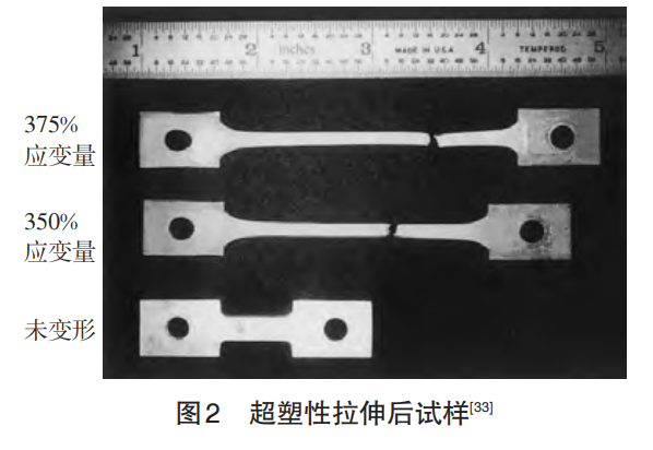 TROEGER等對6000系合金的超塑性研究表明,500 ℃以上時合金表現出超塑性。在 540 ℃應變速率為2×10-4~5×10-4 /s時,應變速率敏感性達到最大值0.5 /s。應變速率為5×10-4 /s時合金的單向拉伸延伸率最大達375%,對應的流變應力為4.7 MPa,如圖2所示。周義等用鋁合金以超塑性成形方式進行了汽車前擋泥板成形試驗,在成形溫度控制在450~500 ℃、最大脹形壓力達到0.42 MPa的條件下,試驗取得成功,整個成形時間為 30~60 min。梁繼業等以 5083 鋁合金為研究對象對車門的鋁合金外板的正反脹超塑性成形工藝進行了研究,在480 ℃和應變速率為 1×10-3 /s 條件下,最大伸長可達到242%。雖然超塑性成形時間比一般成形工藝時間長,但在成形時材料塑性流動的阻力非常小,即使是復雜件也可以一次成形,因而其應用前景非常廣泛。
