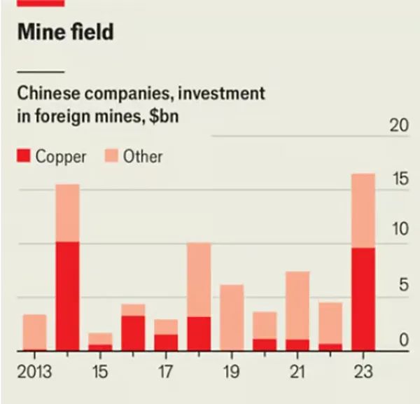 在具體礦產投資上,中國公司也非常具有戰略性。《經濟學人》稱,隨著中國在電池、電動汽車和太陽能電池板等產品上越來越具有競爭力,中國對海外礦業的投資也越來越多。銅礦是電氣化的重要材料,去年中國企業對這種這礦產的投資約占其海外礦產投資的3/5。